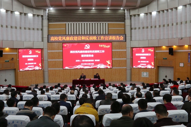 为扎实推进“不忘初心、牢记使命”主题教育,根据四川省纪委监委关于加强省属高校党风廉政建设的统一安排部署,10月25日上午,高校党风廉政廉政建设和反腐败工作宣讲报告会在四教报告厅举行。四川省纪委常委刘光辉作了题为“高校党风廉政建设和反腐败工作”的宣讲报告。四川省纪委监委第一纪检监察室正处长级副主任、一级调研员周智勇;在校全体校领导、校级干部,副处及以上中层领导干部,纪委办公室、纪委纪检监察室、机关党委全体人员;成都工业学院校领导、中层干部、纪检员和党员代表听取了报告。校党委书记边慧敏主持报告会。